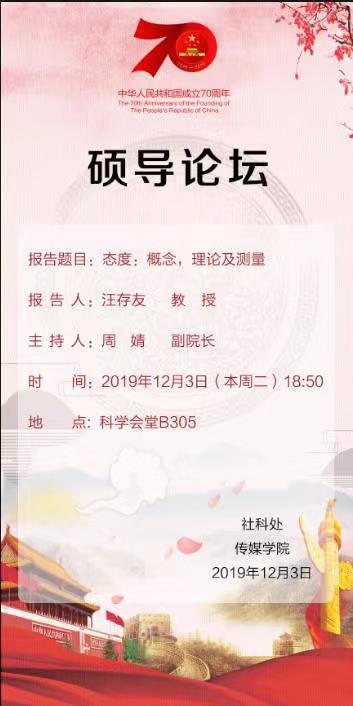 2019年12月3日19点,永利yl23455在科学会堂B305举办了2019-2020年度第一期硕导论坛。硕导论坛旨在搭建硕士研究生导师、青年教师与员工之间的交流平台,为公司青年教师提供学习机会,为研究生毕业论文开题开阔学术视野、提供科研思路。此次论坛邀请公司副经理、硕士研究生导师汪存友教授,作题为《态度:概念,理论及测量》的报告。永利yl23455副经理周婧、部分青年教师及全体研究生参加此次论坛,论坛由副经理周婧主持。