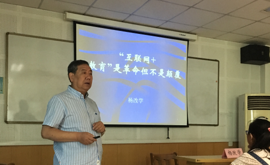 会前杨教授播放了一个关于信息技术引发教育发展的热点视频短片,极大地引起了与会者兴趣。报告会中,杨教授首先由教育部(2015年)40号文件引出互联网+教育,着重分析了第六个重点行动益民服务中的内容,提出探索新型教育服务的供给方式,鼓励互联网企业、社会结构和在线教师开发数字资源。接着,杨教授介绍了我国教育信息化三年六个突破以及“互联网”与“互联网+教育”的基本情况,指出“互联网+教育”下慕课的教学形式和授课形式。最后,杨教授提出慕课在高等教育应用问题主要是资源建设和学习模式以及慕课开发存在的不足。